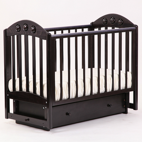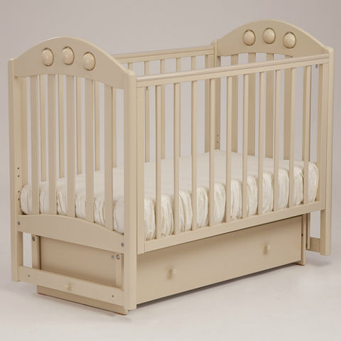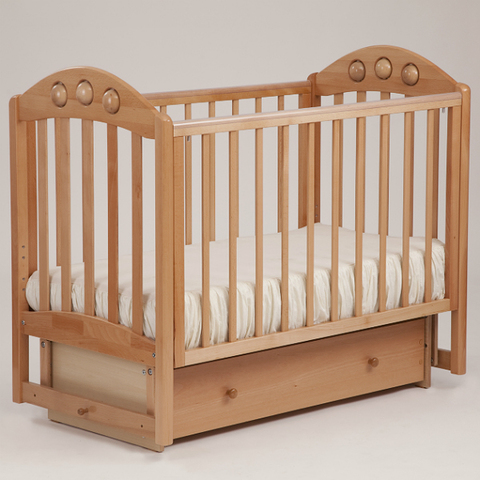Детская кроватка Орхидея от российской компании Кубаньлесстрой с маятниковым механизмом поперечного качения и ящиком на роликовых направляющих.