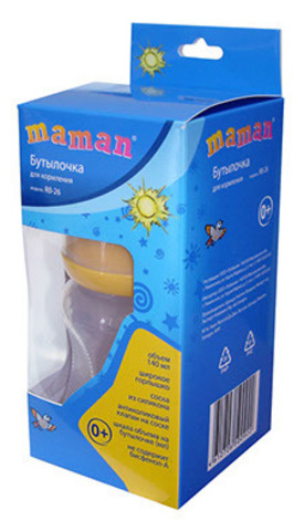 Бутылочка для кормления MAMAN RB26 - для детей с рождения. Широкое горлышко бутылочки обеспечивает правильную технику захвата соски ребёнком, а благодаря слегка вогнутым стенкам бутылочку легко держать в руке при кормлении малыша. Соска из мягкого силикона не имеет запаха, дольше сохраняет форму и легко моется. Антиколиковый клапан на соске предназначен для предотвращения попадания воздуха в желудок малыша при кормлении. Бутылочка изготовлена из безопасного материала, не содержащего бисфенол-А, который не вступает в химическую реакцию с содержимым бутылочки и не выделяет вредных веществ при стерилизации. Бутылочки подходят для использования с молокоотсосами maman.