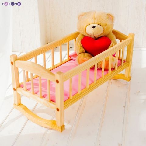 Деревянная кроватка-люлька для кукол, розовый текстиль