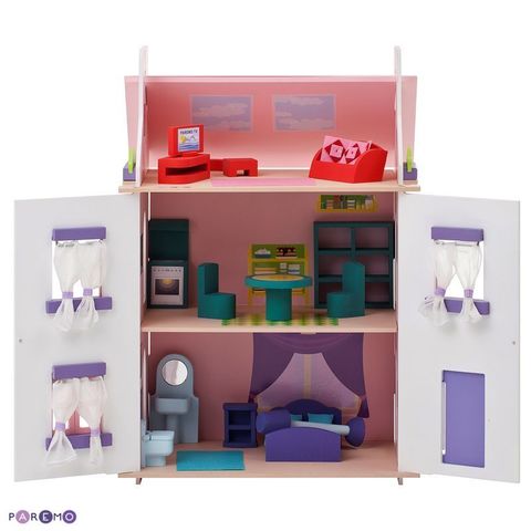 - Кукольный дом «Анастасия" относится к типу закрытых домиков (лицевые фасады открываются, створки крыши перекидываются или полностью снимаются для удобства игры)