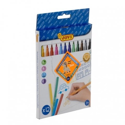 Набор фломастеров 12 цветов с особо прочным наконечником. Удобная треугольная форма зоны захвата эргономична, тренирует навык правильного захвата, снижает нагрузку на кисти рук. Полностью безопасные гипоаллергенные чернила на водной основе с пищевыми красителями. Не высыхают без колпачка в течение 96 часов. Длина письма 400 м. Специальный вентилируемый колпачок обеспечивает прохождение воздуха при случайном проглатывании. Легко смываются с кожи и отстирываются с большинства видов тканей.