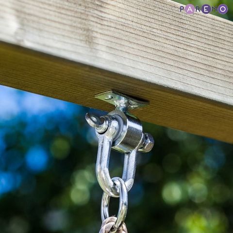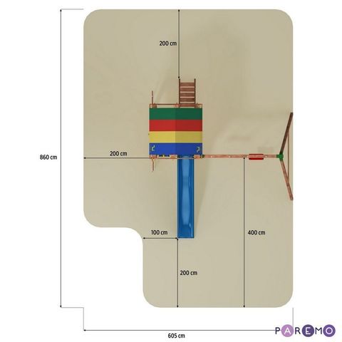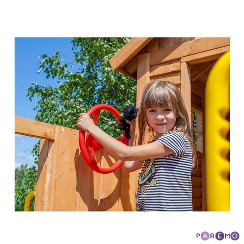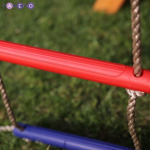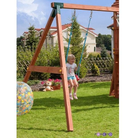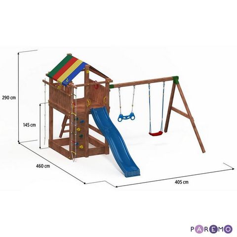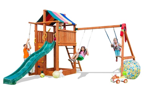 Игровой набор для детской площадки: домик с тентом, горка с лестницей, песочница, канат, веревочная лестница, скалолазная доска и 2 качели