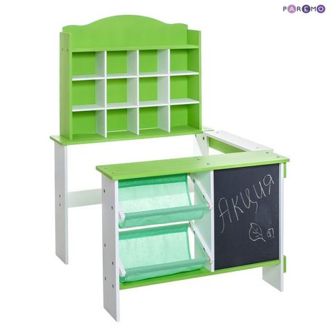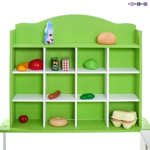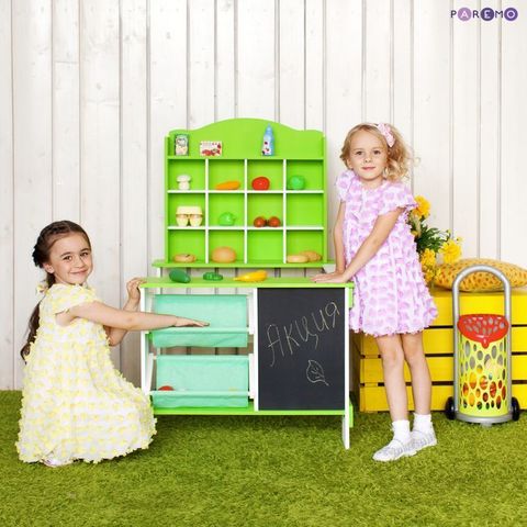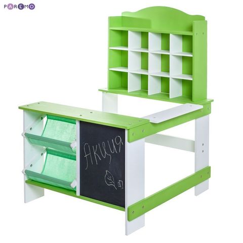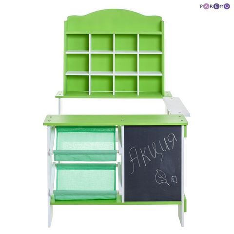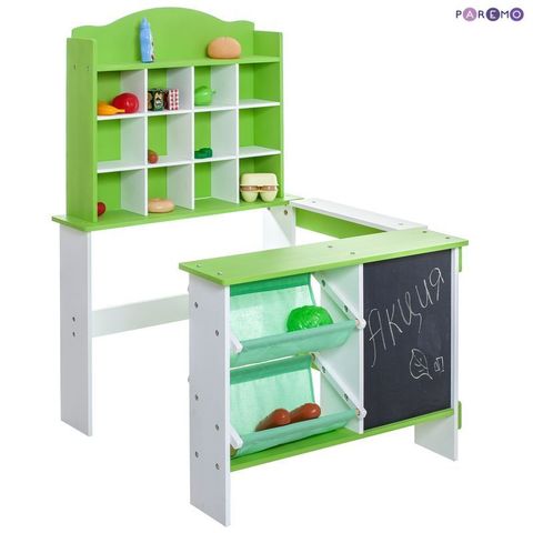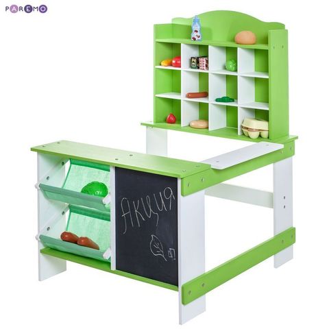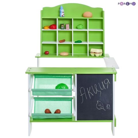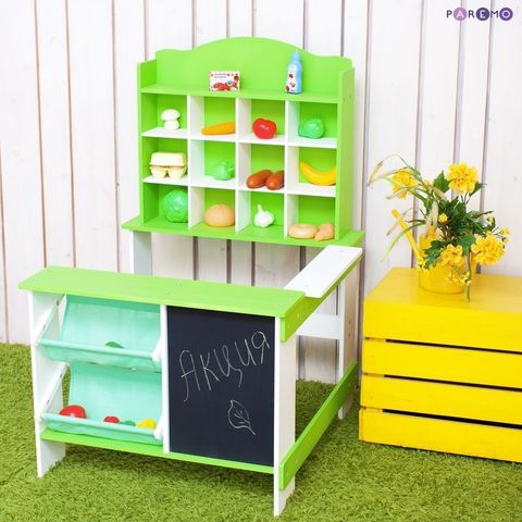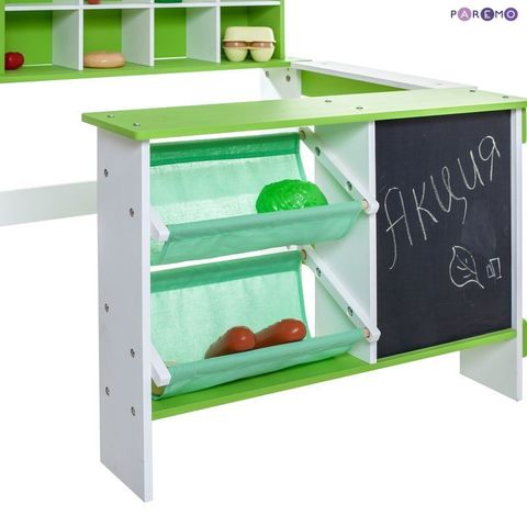 - В комплекте: каркас магазина, текстильные навесы под прилавком, доска. ВНИМАНИЕ: игрушечные продукты, кассовый аппарат и тележка для покупок приобретается отдельно!