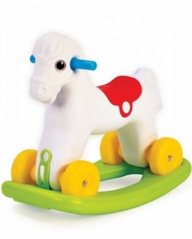 Лошадка 2 в 1 качалка-каталка с отстегивающимся основанием. Основание легко отстегивается и пристегивается при помощи специального замка. На голове есть специальные ручки для держания.