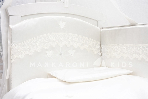 Комплект в детскую кроватку Makkaroni Kids «Бабочки» E/125x65 6 предметов выполнен из экологически чистых материалов – хлопка (сатин), известного своей гипоаллергенностью и прочностью. Высокие бортики с наполнителем из холлофайбера защищают от ушибов и сквозняков. Также, в комплект входят подушка и одеяло с наполнителем из бамбукового волокна, которое оказывает антибактериальное действие, хорошо пропускает воздух и регулирует температуру тела малыша. Комплект белья выполнен в изящном дизайне, украшен стразами, аппликацией, кружевом, вышивкой.