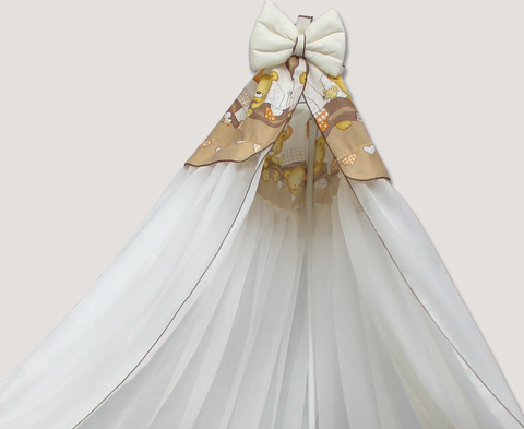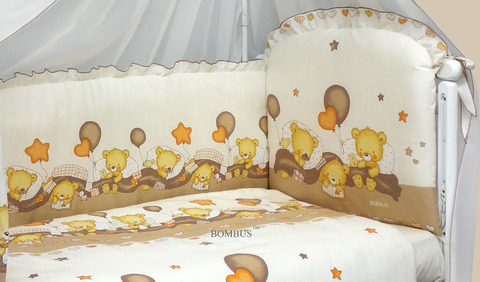 Комплект в кроватку Bombus «Мишутки» 7 предметов стильный, исполнен по европейскому дизайну. Нежный комплект в младенческую кроватку подойдет как мальчикам, так и девочкам. Такой комплект не только станет незаменимым в спальне вашего малыша, но и подарит множество сладостных мгновений легкого и спокойного сна. Комплект изготовлен из 100% хлопка. Натуральный хлопок обладает успокаивающим действием на кожу. В качестве наполнителя используется Холлкон, он хорошо пропускает влагу, гипоаллергенный, дышащий и создает комфортный микроклимат в кроватке. Нежный балдахин изготовленный из мягкой вуали и отделанный вставкой из ткани и украшенный объемным бантом, создаст уют.