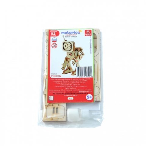 С помощью 52 деталей деревянного конструктора 'Флеш' ребенок может собрать милого робота. Для того, чтобы собрать данную модель, необходимо постепенно склеивать все детали между собой. После того, как игрушка полностью собрана, ее можно отшлифовать наждачной бумагой, входящей в комплект. У собранного робота двигаются руки и поворачивается голова, что делает процесс игры очень увлекательным. Комплект: детали конструктора, наждачная бумага, клей. Размер упаковки: 1 х 12.5 х 22.5 см. Размер собранного конструктора: 14 х 7.5 х 6 см.