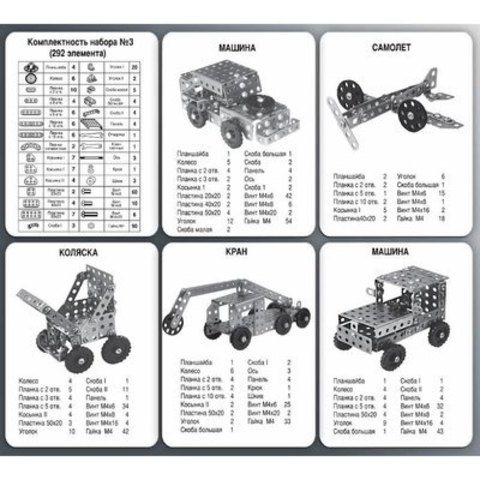 Конструктор металлический номер три - прекрасная обучающая и развивающая игра для детей, учащихся младших и средних классов школы. Каждому ребенку понравится самому создавать модели, пользуясь таким"взрослым"материалом! Ведь в набор входят настоящие винты, ключи и отвертки! Такой конструктор разовьет мелкую моторику, смекалку и усидчивость. В набор входит 292 элемента: скобы, панели, колеса, планки, пластины, уголки, винты, гайки, отвертка и гаечный ключ. В коробке также есть прекрасно оформленная инструкция по сборке, в которой детально описано, как собирать следующие модели: 2 вида машинок, самолет, коляску и кран. Всеми поделками можно играть! Но это не предел! можно собрать все, что угодно, руководствуясь собственной фантазией!