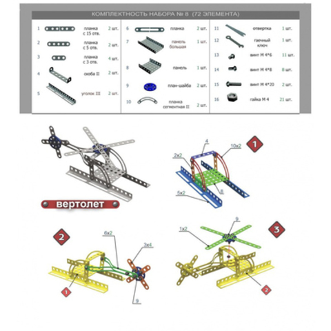 Конструктор металлический №8 для уроков труда займет почетное место среди любимых игрушек ребенка. Изготовленный из прочного металла, он прослужит надежным спутником детских игр долгие годы. Такой конструктор подойдет ребенку от 6 лет. В набор входит 72 элемента: планки, пластины, уголки, скобы, панели, шайбы, винты, гайки, отвертка и гаечный ключ. Такие детали нравятся детям - ведь они"настоящие","взрослые", а каждый ребенок мечтает скорее подрасти. Руководствуясь красочной и подробной инструкцией по сборке, которая также идет в комплекте, малыш сможет создать очень похожие на настоящие вертолет и санки. И еще много-много всего, что только подскажет ребенку фантазия!