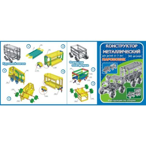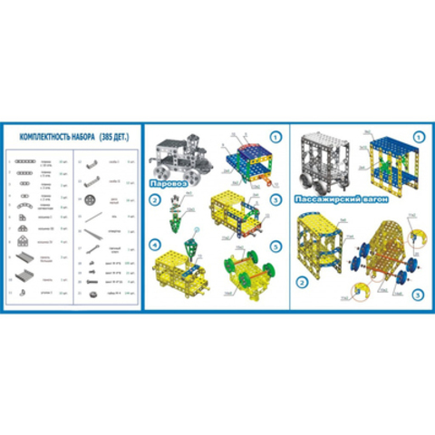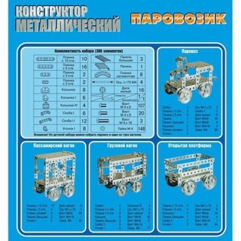 Конструктор металлический"Паровозик"- это набор из 386 металлических деталей, включающий настоящие гайки, винты и ключи и многое другое! Когда-то такие наборы были обязательными на уроках труда в младших классах. Сейчас у детей есть возможность играть в него и дома! Конструктор"Паровозик"позволяет собрать паровоз и один из трех возможных вагонов - пассажирский, грузовой или платформу. Но это не все! детали можно использовать не по инструкции, а следуя воображению! И тогда количество изделий ограничится только фантазией и количеством деталей. В комплект входит:386 разложенных по секциям деталей, красочная инструкция