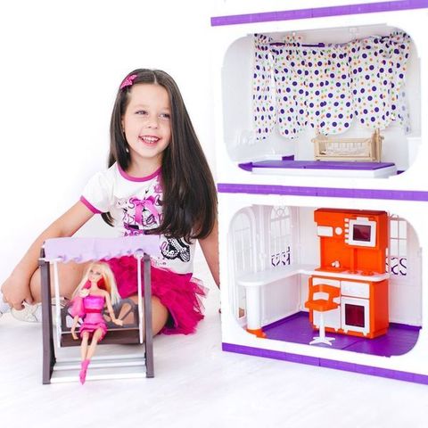 - В комплекте: кухня, столовая, гостиная, спальня, люлька для куклы до 15 см, качели