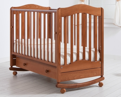 Детская кроватка-качалка «Ванечка» фабрики Гандылян с классическими визуально простыми линиями придадут комнате особый тонкий стиль. Дуги-полозья для раскачивания имеют ограничители качания, они вместе со сбалансированным центром тяжести делают амплитуду раскачивания кроватки безопасной для малыша. Две пары колес на ножках помогут зафиксировать кроватку от раскачивания, а также облегчат ее перемещение в комнатном пространстве. Гладкое лаковое покрытие поверхностей кроватки защитит кожу малыша от получения травм. Для покрытия используется лак на водорастворимой основе – он абсолютно безопасен для младенца. Вместительный ящик для белья в основании выполнен из ламинированного ДСП и снабжен шариковыми направляющими.