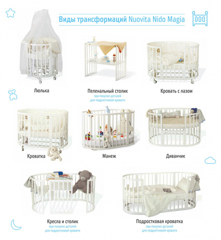 Виды трансформации колыбель, детская кровать, приставная кровать, манеж, диван