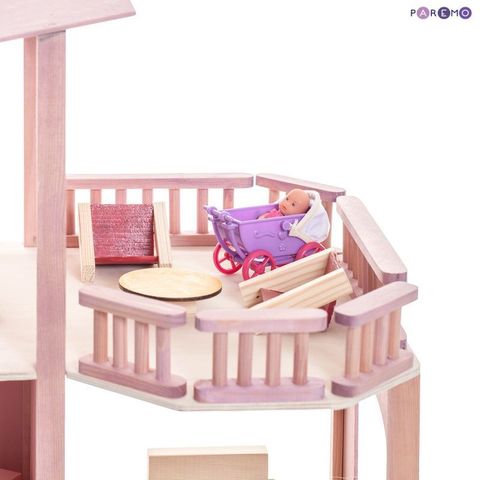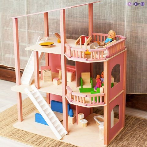 - На первом этаже – ванная комната и кукольная спальня, на втором этаже – кухня и гостиная, на третьем этаже – спортивно-игровая комната и балкон с зоной релакс.