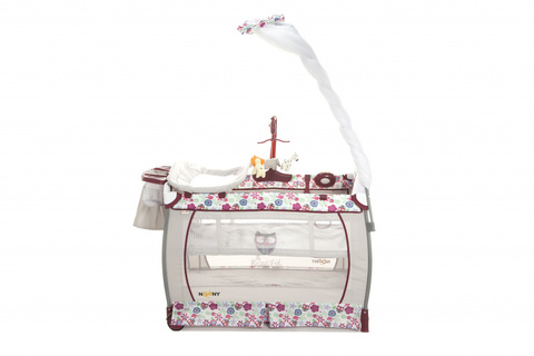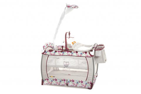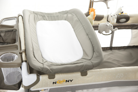 Детский манеж Манеж Noony Friends. Комплектуется музыкальным блоком, коробкой для подгузников, сумкой для переноски. Манеж оснащен лазом на молнии, кольцами для переноски и удобными колёсиками. На боку манежа - кармашек.