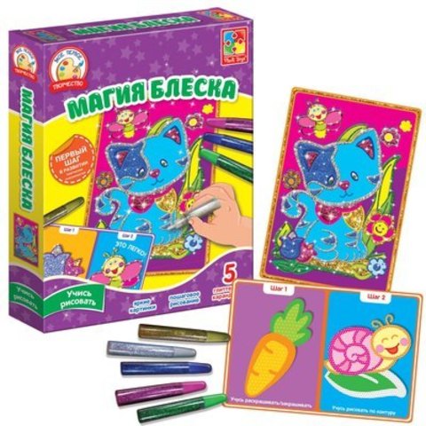 Набор для творчества призван открыть ребенку мир художественного искусства. Вместе с «Магией блеска» сделать первые шаги в творчестве очень легко! Развивайте у ребенка цветоощущение, навык декорирования, а, как бонус, получите красивую картину на стену. Создание картинки проходит 3 этапа. Пусть ребенок потренируется раскрашивать отмеченные участки соответствующим цветом. После – выработаем навык рисования по контуру, обведя тренировочную иллюстрацию. Теперь малыш готов к финальному шедевру! На картинке есть пустое место для записи, чтобы обозначить возраст и имя ребенка. Используя петельку-крепеж, разместите на стене памятную декорацию. Серия «Мое первое творчество» приобщает к деятельности самых маленьких. В наборе: 3 иллюстрации, 5 глиттерных карандашей, петля-крепеж для картины и книжечка с инструкцией.