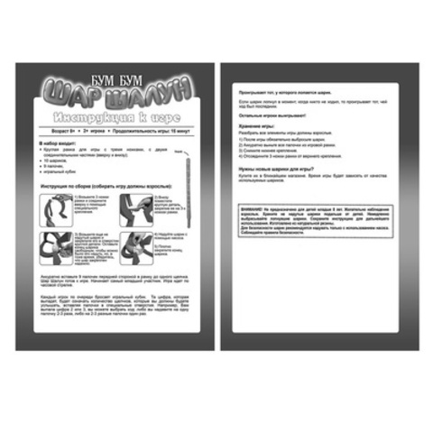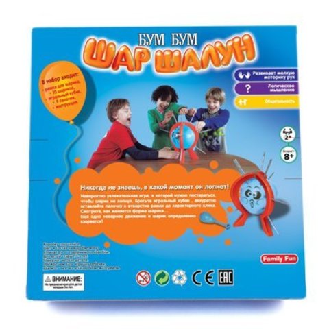 Настольная игра"Шар Шалун"от бренда FamilyFun сумеет заинтересовать как детей, так и взрослых. Правила игры очень простые: надуйте шарик внутри специальной рамки. Бросьте кубик и та цифра, которая выпадет, будет означать количество щелчков, которые вы должны будете услышать, вставляя палочки в специальные отверстия. Игрок, ход которого приведет в взрыву шарика, проигрывает. В комплект входит: рамка для игры, 10 специальных (уплотненных шаров), 9 палочек и подробная инструкция. Рекомендовано детям старше 8 лет.