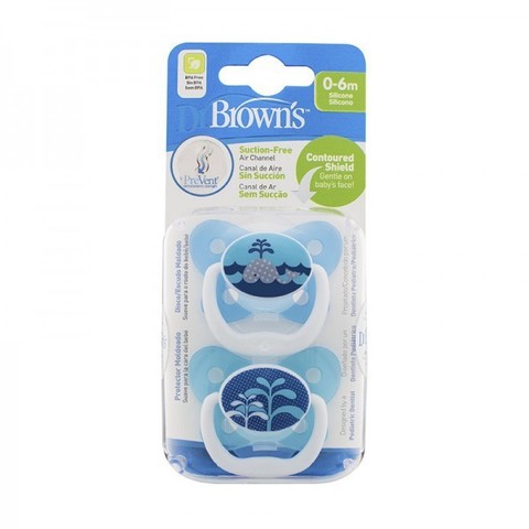 Пустышка Dr Brown's PreVent «Бабочка», PV12402, 0-6 месяцев, с крышкой, для мальчиков, набор из 2 шт. - изготовлены из силикона — идеального материала без вкуса и запаха, который не вступает в реакцию со слюной и не вызывает аллергии. Пустышки комплектуются защитным колпачком на защелке и допускают паровую стерилизацию. Рекомендовано в целях гигиены и безопасности заменять пустышки 1 раз в месяц. Особенности пустышки PreVent: воздушный канал ослабляет разрежение в ротовой полости и снижает давление на верхнее небо. Мягкая, ослабляющая разрежение грушевидная часть соски при сосании расходится в стороны. Основание пустышки PreVent в два раза тоньше, чем у аналогичных пустышек, что уменьшает негативное влияние на зубы и ротовую полость ребенка.
