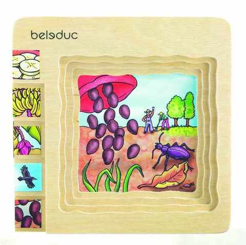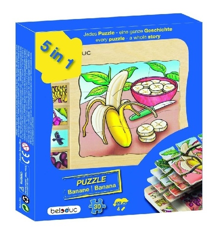 Развивающий пазл Beleduc Банан представляет собой увлекательный набор из 30 разноцветных деталей с изображениями и рамка вкладыш. Из существующих элементов ребенок сможет собрать 5 картинок на тему процесса формирования и созревания тропического фрукта - банана и удобно укладывать их в рамку, которая состоит из 5 слоев. Каждый слой в этой серии – это целая история. Ваш юный садовод сможет воспроизвести картину выращивания банана. В процессе игры у ребенка развивается визуальное восприятие, наблюдательность, он учится различать цвета и формы. Размер: 145 x 145 x 18 мм