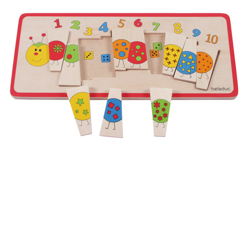Развивающий Пазл Beleduc Гусеница представляет собой увлекательный набор из рамки и 10 разноцветных деталей, собрав которые ребенок сможет увидеть изображение забавной гусеницы. Научиться считать с помощью цветной гусеницы - настоящее удовольствие. В процессе игры дети знакомятся с различными цветами, формами и цифрами от 1 до 10. Точки, изображенные на обратной стороне каждого элемента, помогают правильно разместить детали пазла. Размер: 375 x 160 x 16 мм.