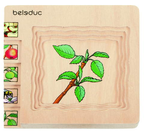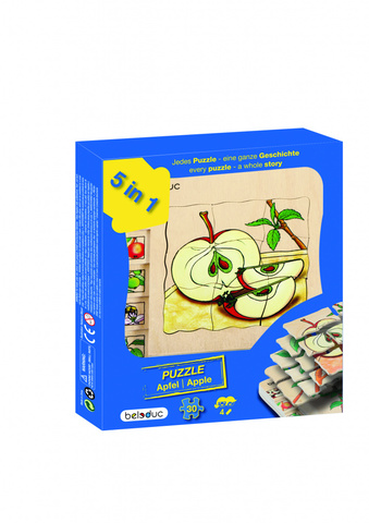 Развивающий пазл Beleduc Яблоко представляет собой увлекательный набор из 30 разноцветных деталей с изображениями и рамка вкладыш. Задача ребенка – собрать не только части каждого пазла, но и сложить слоями все пазлы в правильной последовательности. Из существующих элементов ребенок сможет собрать 5 картинок на тему процесса формирования и созревания яблока и удобно укладывать их в рамку, которая состоит из 5 слоев. Каждый слой в этой серии – это целая история. Ваш юный садовод-огородник сможет воспроизвести картину подрастания яблони и созревания плода. Размер:145 x 145 x 18 мм
