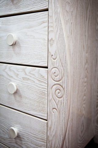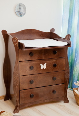 Элегантные ножки комода С 577 украшенные искусной резьбой, которая своими воздушными завитками декорирует фасад комода и "Бабочка", инкрустированная египетскими кристаллами, образуют неподражаемый дизайн спальни малыша.