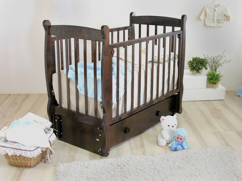 Тип: маятниковый механизм продольного качания с фиксатором. Закрытый глубокий ящик для хранения детских принадлежностей и игрушек исключает запыление. Ортопедическое ложе кроватки регулируется по высоте в двух положениях. Защитная накладкуа защитит кроватку от острых зубов малыша и вместе с тем предохранит от повреждения десны и зубки малютки. Для того чтобы опустить боковое ограждение, нужно одновременно отжать ручки с обеих сторон ограждения. Поднятие и фиксирование осуществляется одной рукой. С помощью этого устройства можно без лишних усилий убрать ограждение и приставить кроватку малыша рядом с кроватью мамы (ЗПУ-7). В кроватке установлены 2 съемные стойки, которые можно легко убрать, чтобы ребенок мог самостоятельно укладываться спать.