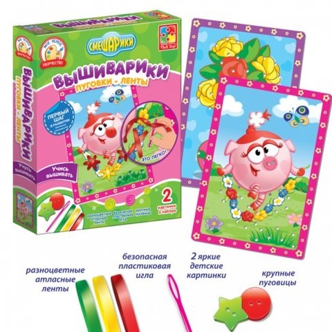 Набор для творчества 'Нюша' из серии 'Вышиварики: Пуговки-ленты' станет отличным и увлекательным подспорьем в развитии у ребенка творческих навыков. Набор состоит из двух ярких иллюстрированных картинок, разноцветных атласных лент, пластиковой безопасной иглы и крупных ярких пуговиц нестандартной формы. Ребенку будет интересно украшать самостоятельно красочные картинки, заодно он научится основам вышивания и узнает разновидности стежков. Ему поможет в этом специальная инструкция, которая есть в наборе.