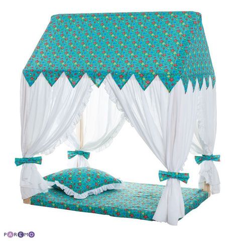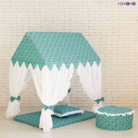 - Комплектация игрового набора: деревянный каркас, чехол в форме домика, 4 банта на липучках, мат в основании, подушка и детский пуфик. Все текстильные элементы съемные для удобства стирки.