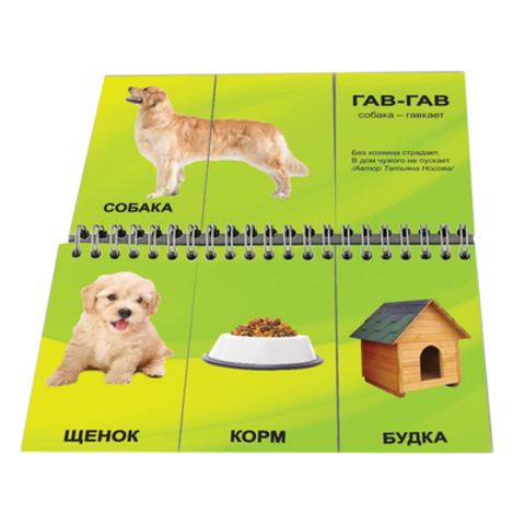 Книга-пазл включает в себя 11 домашних животных, 11 детёнышей, 11 загадок, 11 мест обитания домашних животных и 11 видов еды: собака, индейка, коза, корова, кошка, крольчиха, курица, лошадь, овца, свинья, утка.